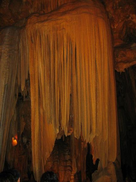 Hanging 'curtains' are formed when water is actually running rather than just dripping. They take over 300 years to form one cubic inch. Note the one on the lower left is so thin that it's translucent.